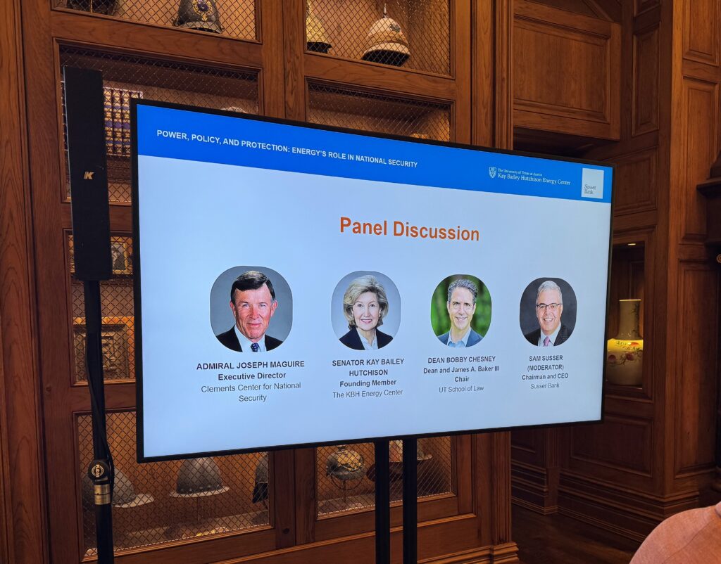 Susser Bank was proud to co-host a timely conversation on energy, policy and national security at Old Parkland in Dallas. Chairman and CEO Sam L. Susser moderated a distinguished panel featuring Senator Kay Bailey Hutchison, Admiral Maguire of the Clements Center for National Security, and Dean Robert (Bobby) Chesney of The University of Texas School of Law, exploring the critical link between energy leadership and global stability. Eleven years ago, Mr. Susser served as the initial co-chair of the Kay Bailey Hutchison Energy Center at The University of Texas at Austin and continues to serve on the Executive Committee.